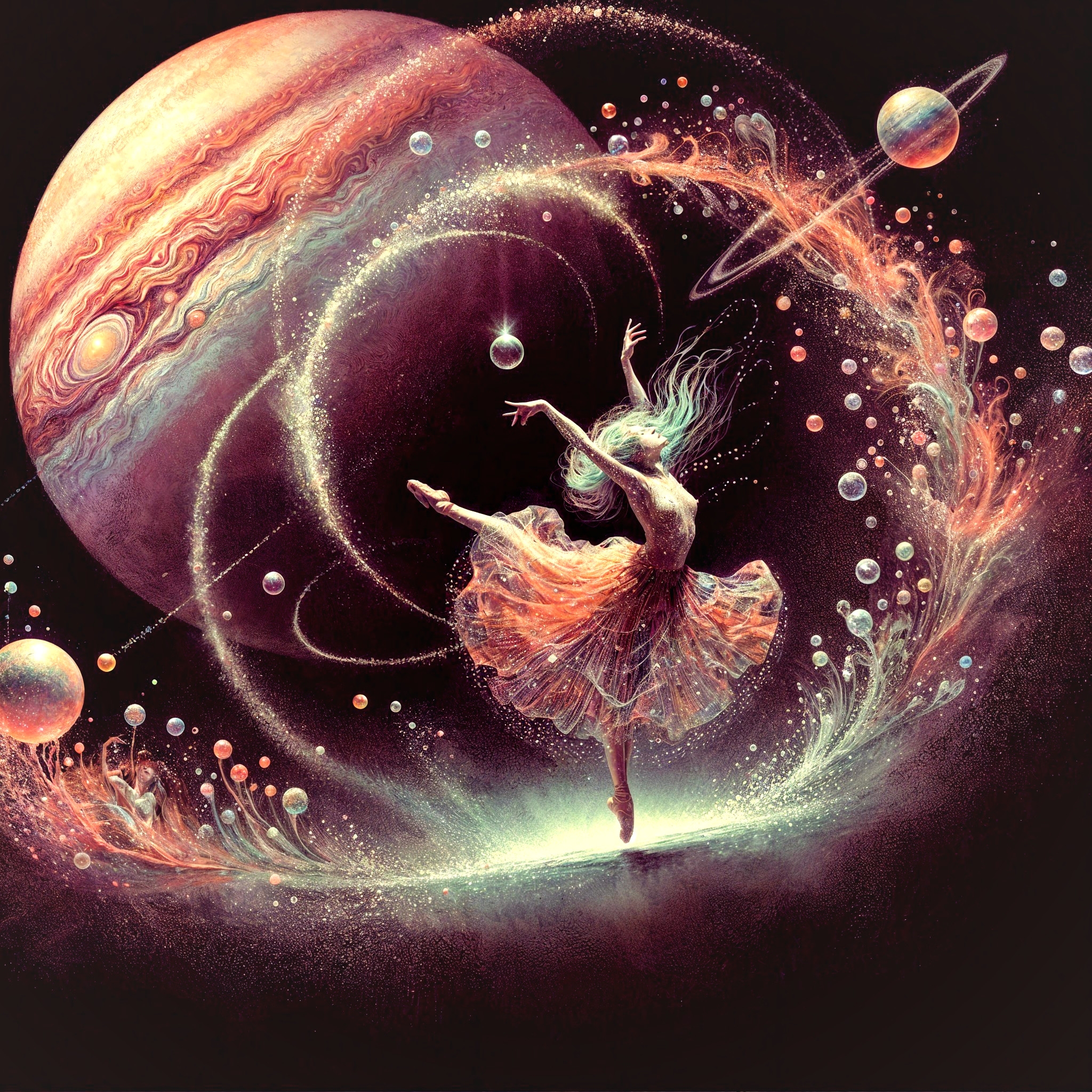 A woman in a surreal landscape filled with psychedelic colors and intricate patterns