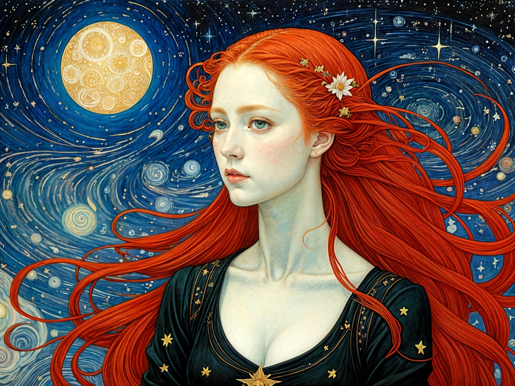 A mystical woman with flowing red hair gazes thoughtfully into the cosmos