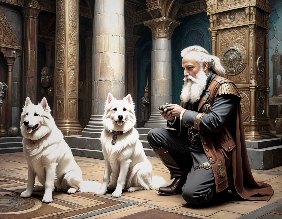 A old steampunk archaeologist with his two loyal Swiss shepherd dogs (Berger Blanc Suisse Dog)