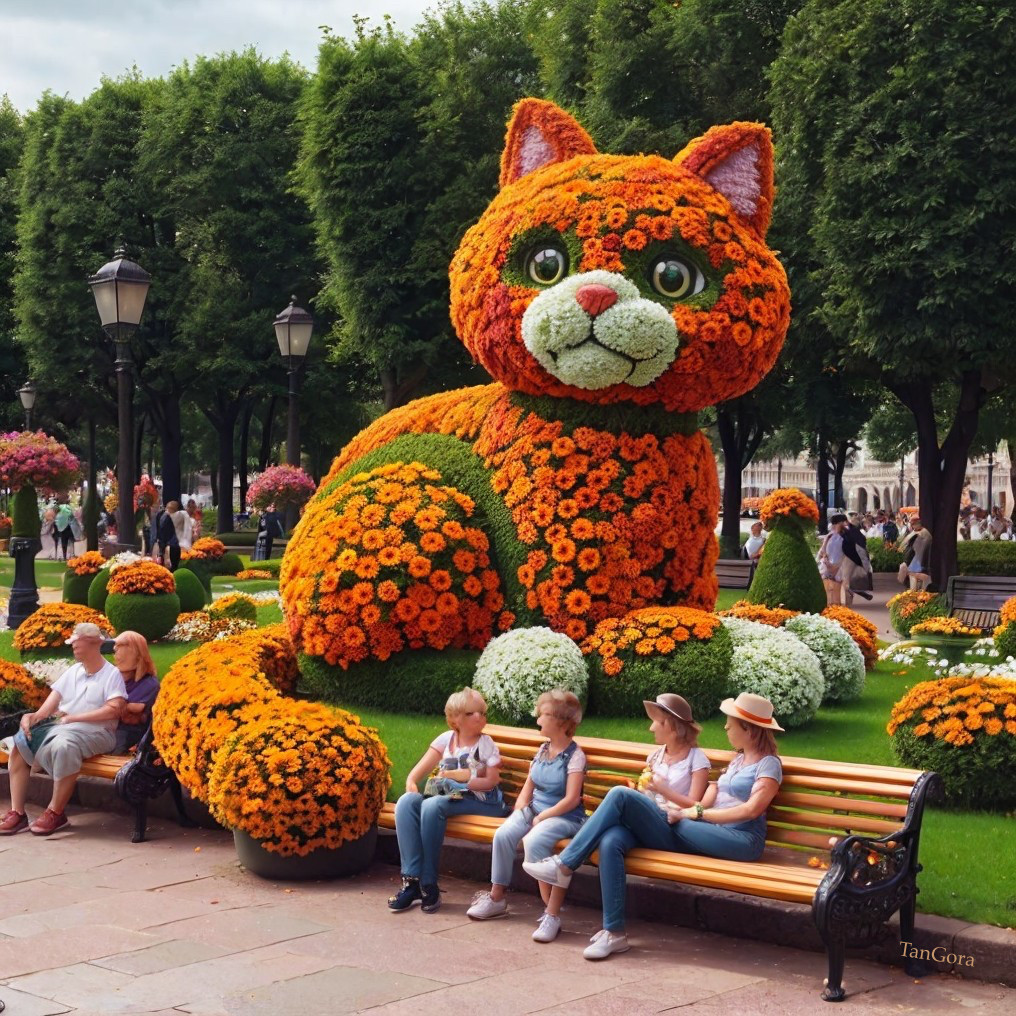 Topiary. A cat in the park made of orange daisies.