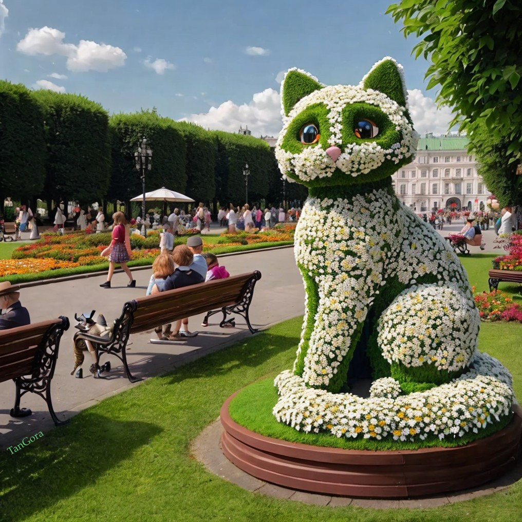 Topiary. A cat in the park made of white daisies.