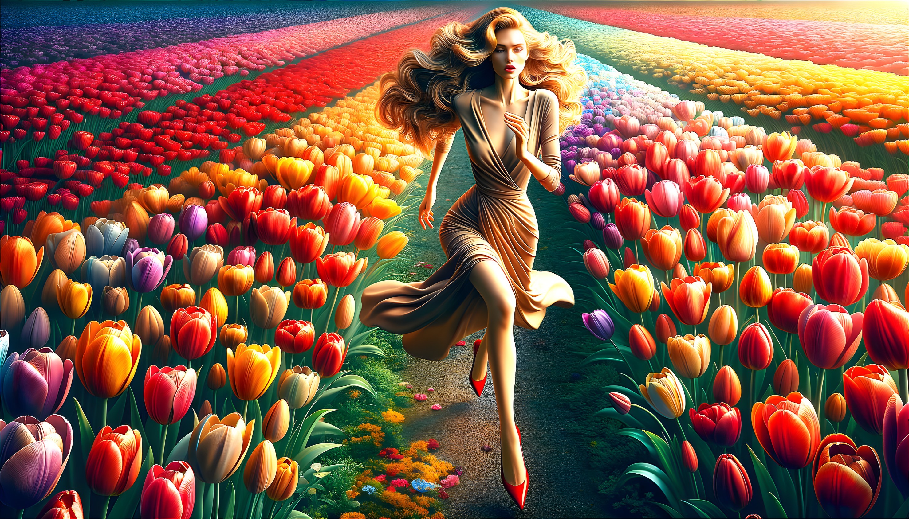 Blonde Beauty Among Tulips