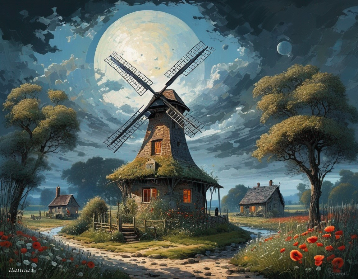 Moonlit Windmill: Twilight Poppies