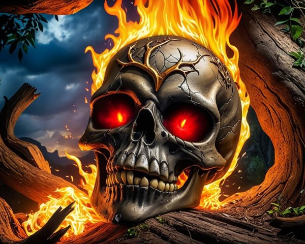 Eerie Metallic Skull Amidst Fiery Branches