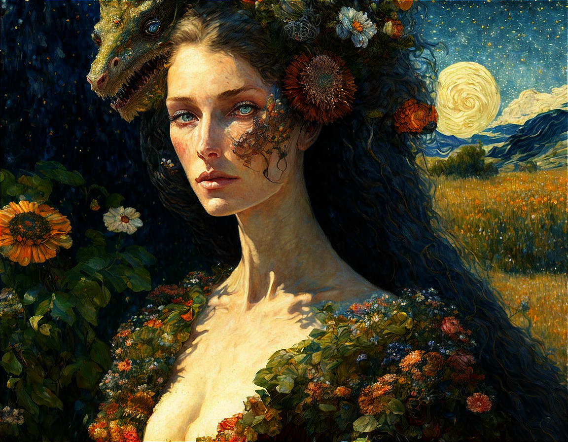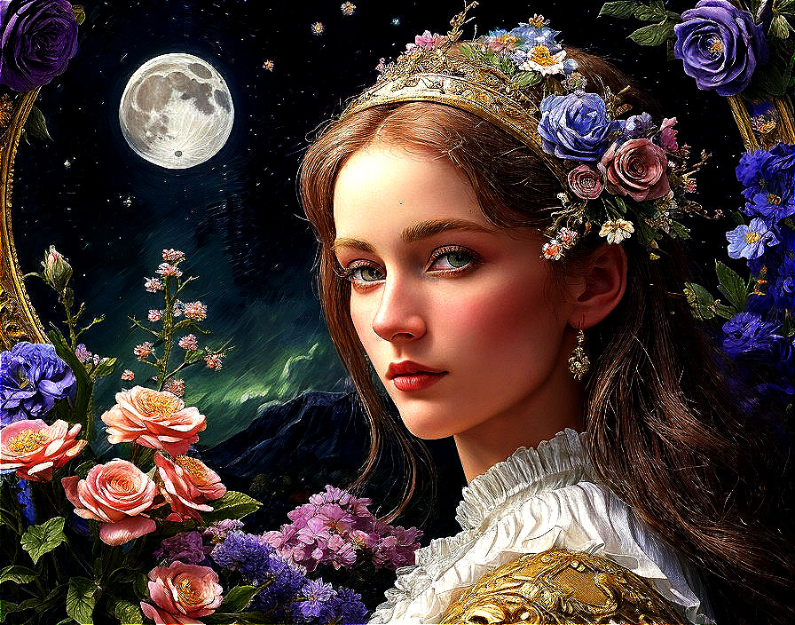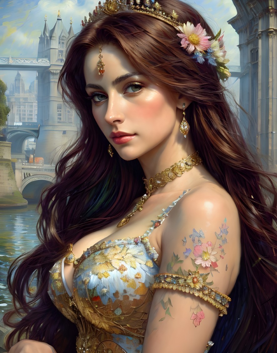A woman with long, wavy brown hair, adorned with flowers and jewelry