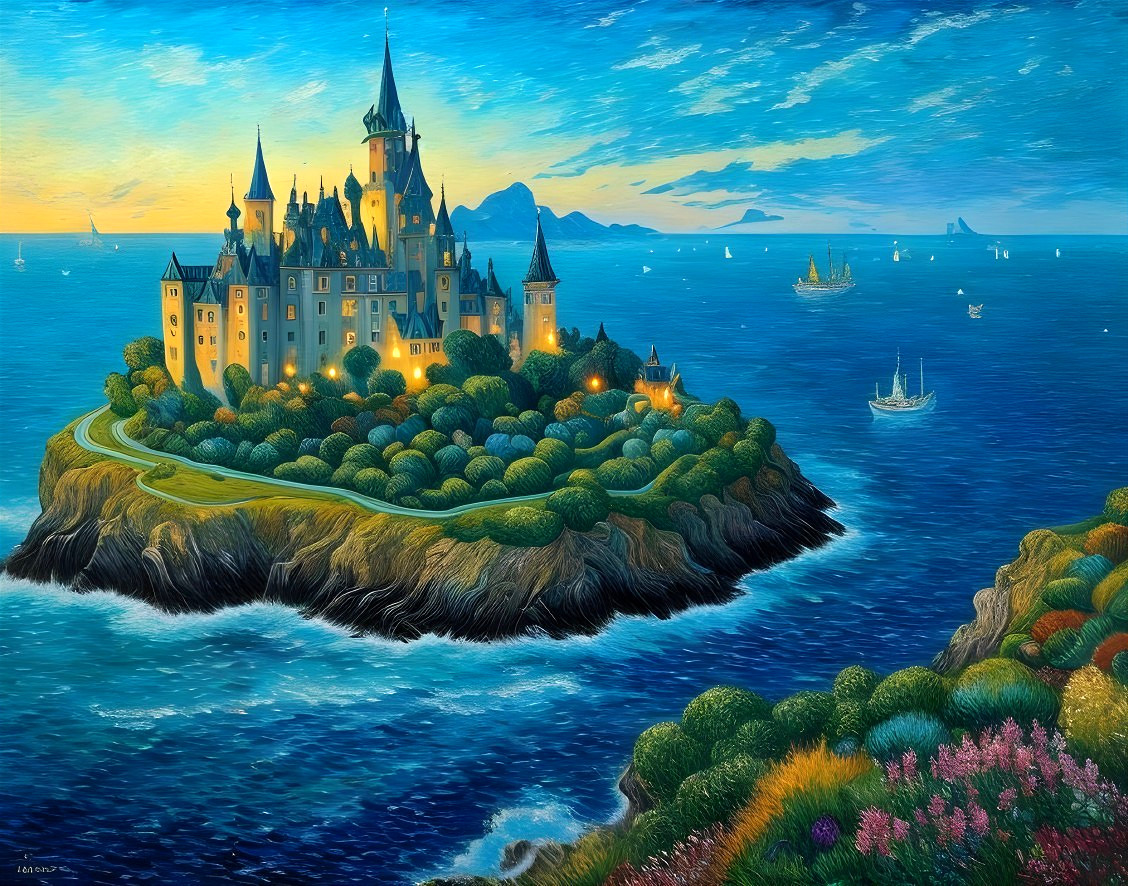 A castle on a cliff at dusk, brightly lit, surrounded by sea and sailing ships
