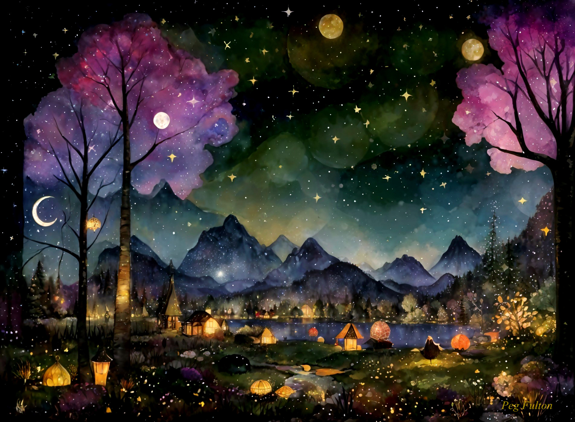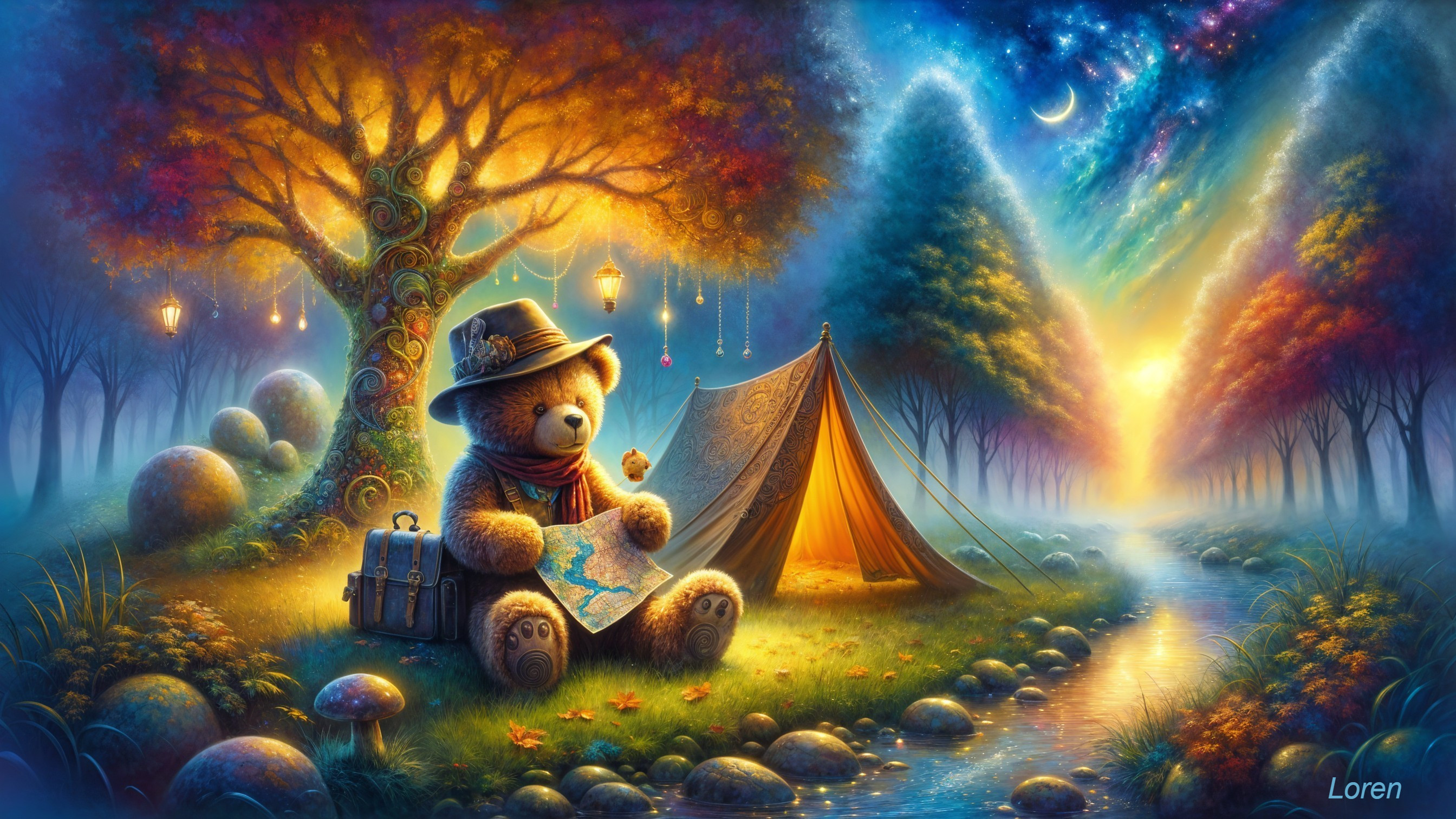 Brain-shaped structure filled with vibrant trees and cosmic elements