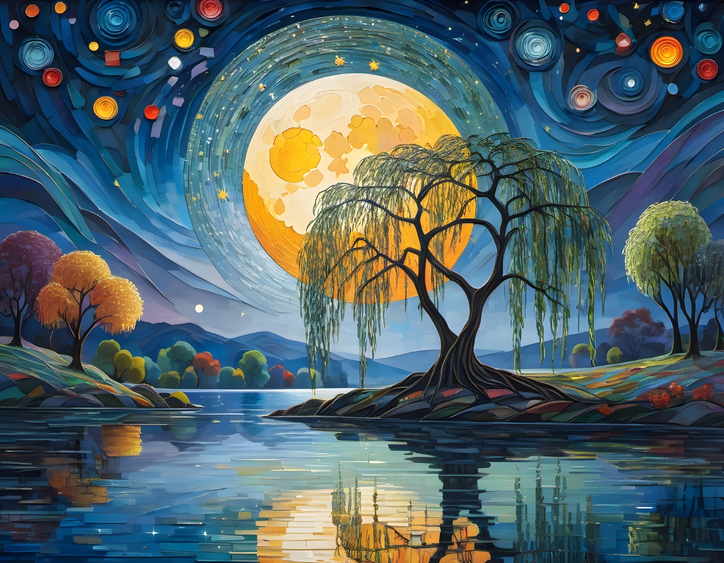 Moonlit Symphony: Cyber Swans & Weeping Willow