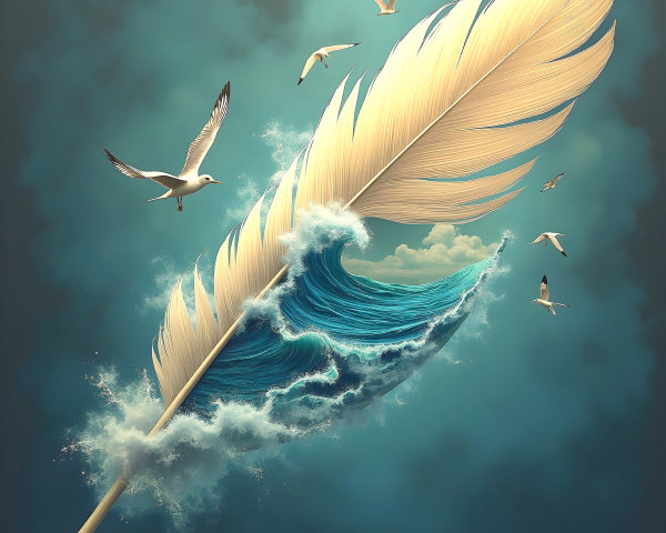 Prompt: A large feather with a detailed sea side landscape painted inside it. Inside the feather, a dreamy fantasy scene unfolds: stormy sea with a great waves and seagulls above sea. The feather edges blend seamlessly with waves from the feather. Hyper-detailed, photorealistic, surreal, with vibrant colors and magical atmosphere. Old captain book background.