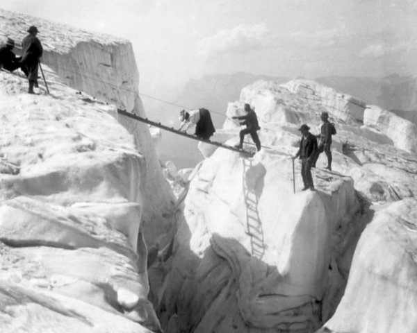 Traversée d'une crevasse dans un glacier du Mont-Blanc.