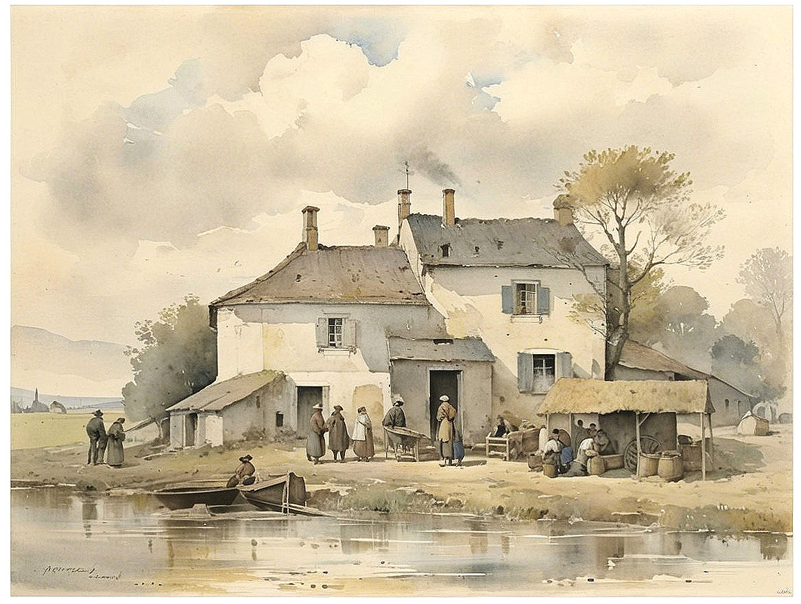 Watercolor Scene of Village Canal with People Gathered