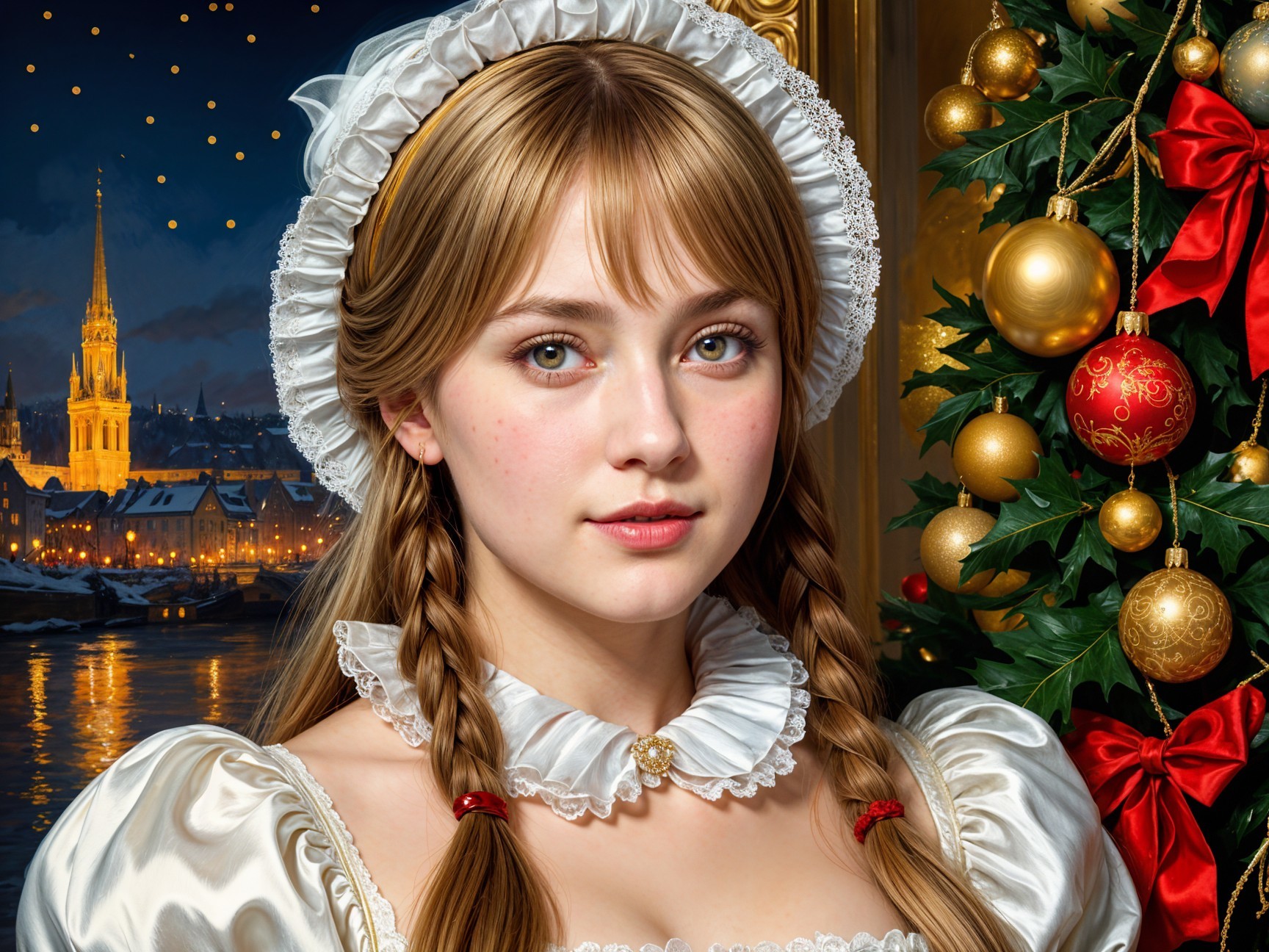 Prompt: Portrait of Irulan , Festive Christmas New Year style , New Year festive atmosphere , The style is Neo noir , sentimentalism ,elegant, Impressionism , Hans Holbein , Auguste Renoir , Franz Xaver Winterhalter , vintage, oil, masterpiece, high detail, art station