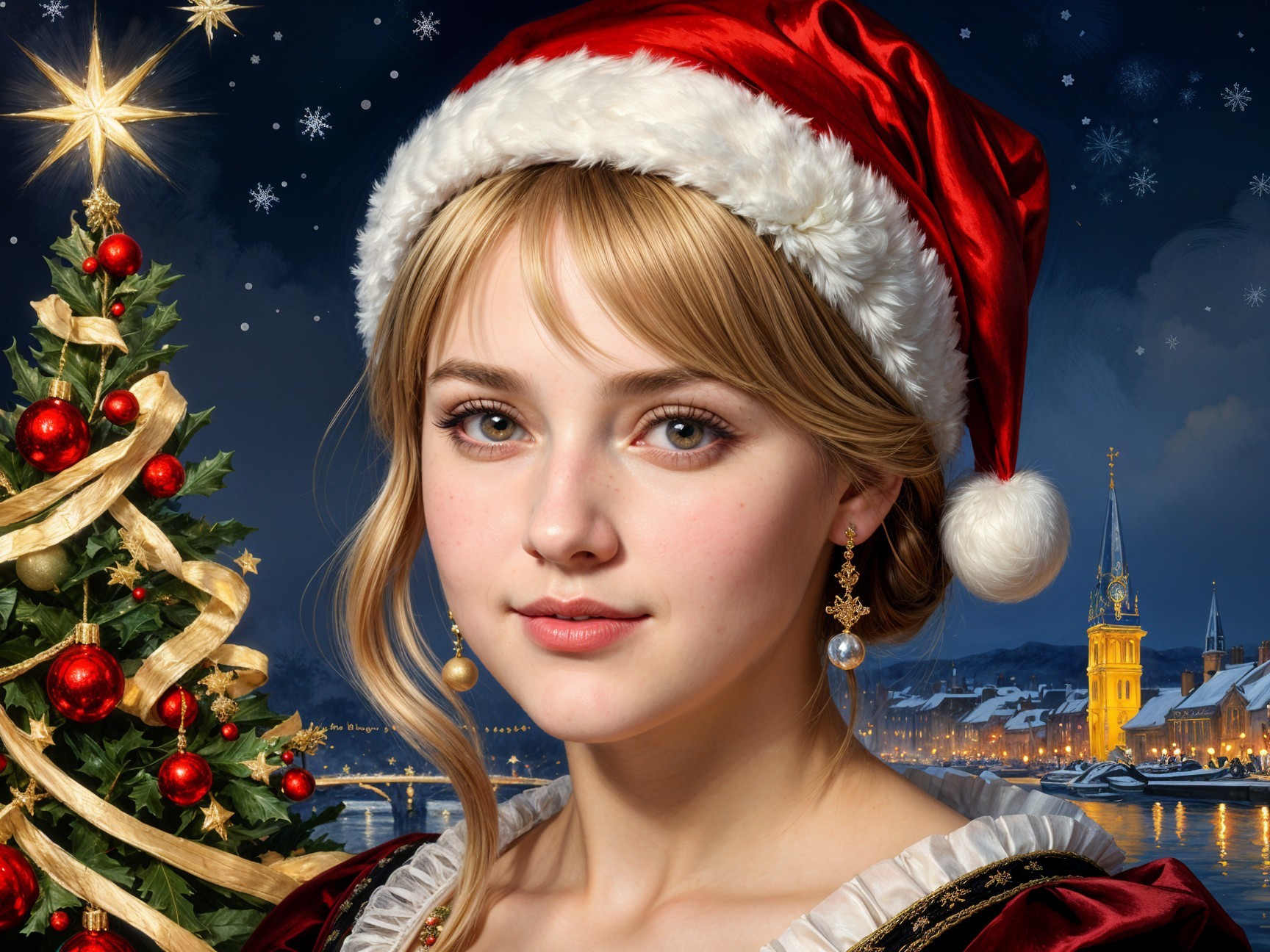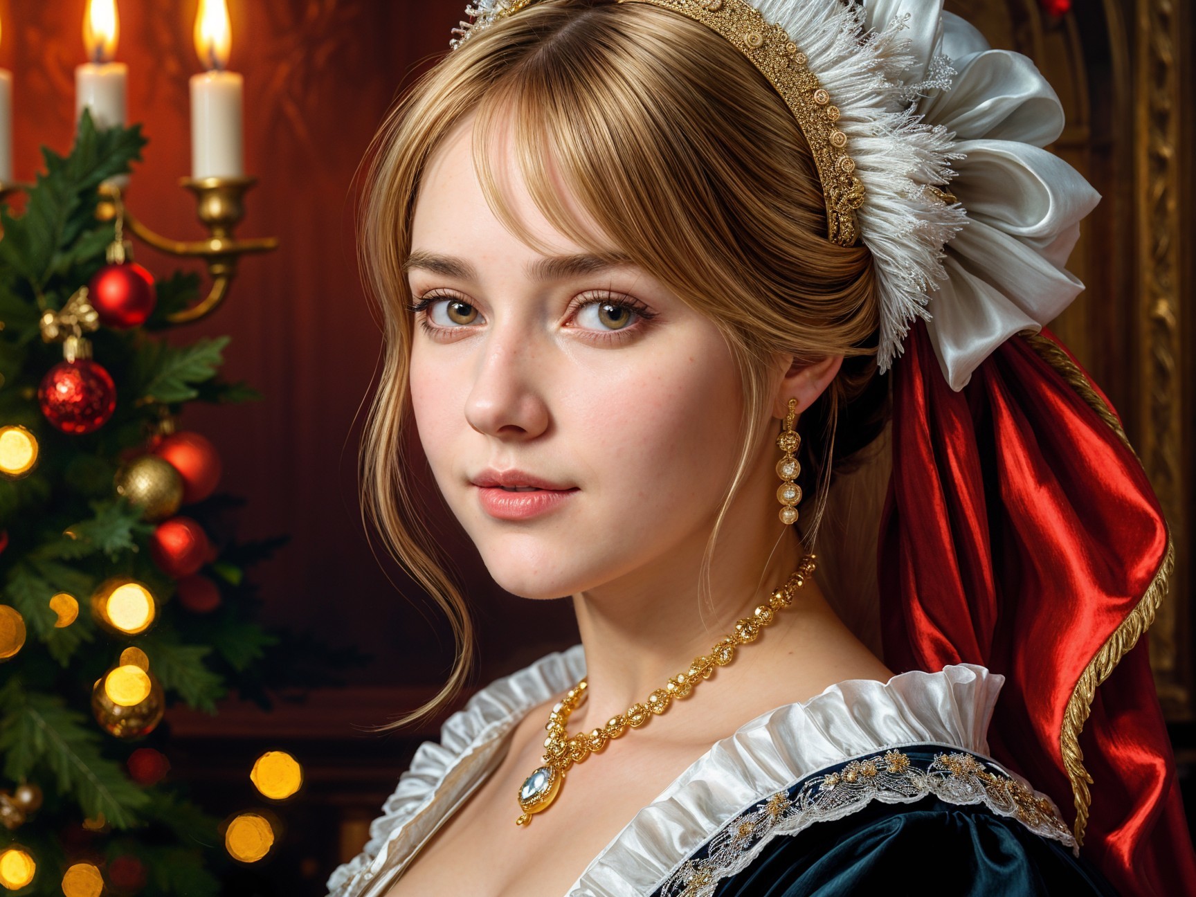 Prompt: Portrait of Marie Rose , Festive Christmas New Year style , New Year festive atmosphere , The style is Neo noir , sentimentalism ,elegant, Impressionism , Hans Holbein , Auguste Renoir , Franz Xaver Winterhalter , vintage, oil, masterpiece, high detail, art station