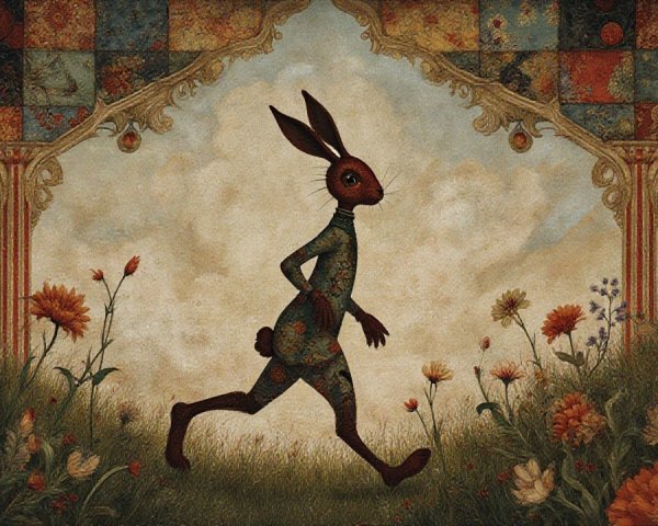 Prompt: folk art capturing a scene reminiscent of the art deco movement, yet embracing patchwork influences. Envision a majestic scene that pays tribute to the grandeur of Renaissance paintings, but with a tinge of dark fantasy. The main subjects are a elevated environment that leads to the mind of an absurdist crooked tall rabbit, with an aura of fanciful whimsy about it walking with the flowers that blow in the meadows wind. Ensure the feel of the canvas hints at a level of texture.