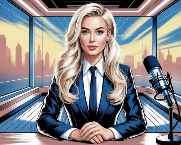 The woman, with a striking appearance, has long, wavy platinum blonde hair cascading over her shoulders. Her facial features are characterized by strong cheekbones, full lips painted a bold shade, and defined eyebrows that accentuate her mesmerizing blue eyes. She is dressed in a fitted pinstripe suit, exuding confidence and sophistication.