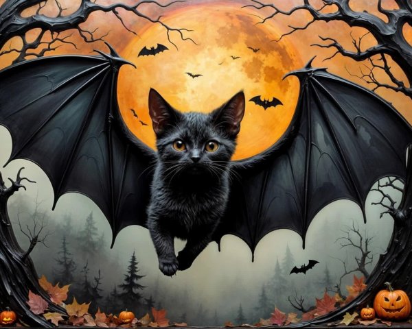 Prompt: Bat-cat with bat wings, in the style of Edward Atkinson Hornel, Kim Keever, Andy Kehoe, John Hoyland and Thom, champlevé enamel, fog, mist, Black Forest, bats, Halloween, lines and metallic colors, vibrant.