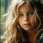 Prompt: a 7 year old girl with wavy brown hair brown eyes and a slight smile and 5 year old a girl with blond braided pigtails blue eyes and a slight smile they are standing in the rain and they are holding a clear umbrella