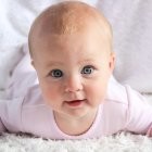 Prompt: a basket of strawberries on a white farmhouse porch with a baby girl wearing a pink onesie and an oversized sun hat, the baby is about 1 month old, her light-brown hair is in VERY VERY ting pigtails, a Pomeranian, golden retriever mix slightly nudges the baby, very realistic, very realistic in the background