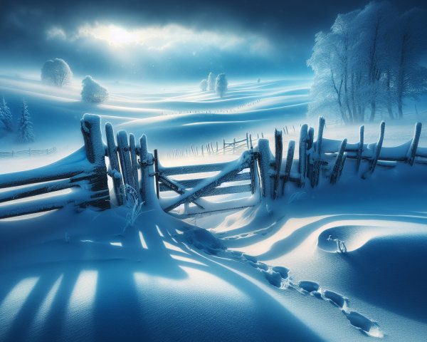 Prompt: Stillness After Snowfall at the Broken Gate: A once-used farm gate stands half-collapsed, its wood warped and hinges rusted, now buried beneath a fresh layer of snow. The fence it once joined is long since vanished, leaving the gate alone, framed by skeletal trees and a pale sky thick with lingering winter clouds. The untouched snow glows faintly with blue shadows, broken only by the pawprints of a fox weaving between drifts. In the distance, a field stretches white and wide toward a barely visible treeline. Maxfield Parrish breathes an ethereal blue luminescence into the snow and clouds, softening the cold into quiet wonder. Andrew Wyeth captures every splinter and snow-caked knot in the broken wood, elevating the forgotten gate into poetry. Albert Bierstadt adds the expansive field and low winter sun, spreading the silence into something holy.