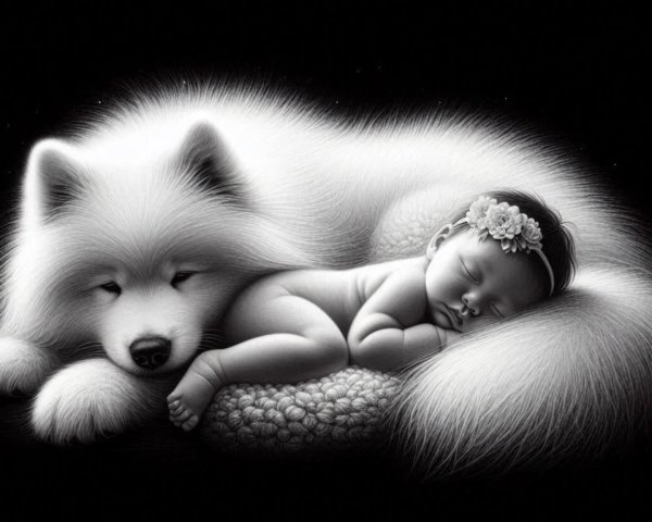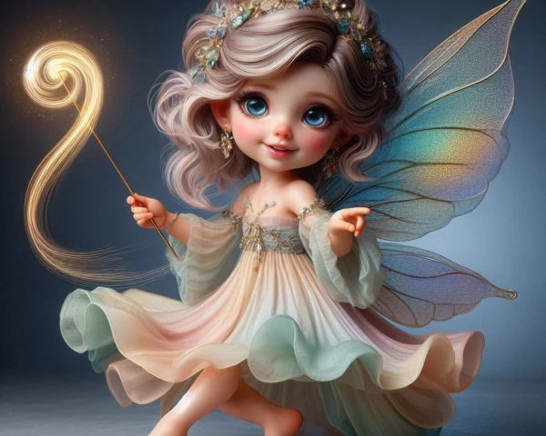 Prompt: Create a whimsical and heartwarming illustration featuring a small child with soft, fair skin and a cherubic face, exuding a sense of joy and innocence. The child should have large, expressive blue eyes and a small mouth that curls into a gentle smile. Their hair is light-colored, perhaps a soft blonde or light brown, with wavy strands framing their face.
