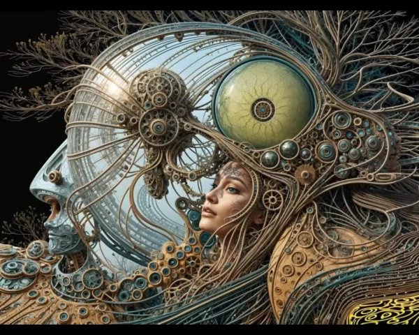 Prompt: Vibrant, whimsical Mandelbrot fractal pastoral landscape with pine trees, a remote log cabin, richly textured acrylic ink and charcoal line art, in a zentangle style mix, blending Amanda Clark's fantastical elements and Catrin Welz-Stein's intricate details with Eyvind Earle's subtle earth tones and Georges Braque's bold geometric patterns, featuring surreal, layered, fragmented forms, by Susanne, misty atmosphere, soft focus sky, dynamic paint splatter, and iridescent, vibrant colours with reflections.