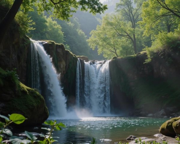 Prompt: Serene waterfall with cascading water, mossy rocks, and lush surrounding trees, creating a tranquil, natural beauty. Gentle mist rises, birds chirp, and sunlight filters through the canopy. A slow pan shot reveals the idyllic scene.