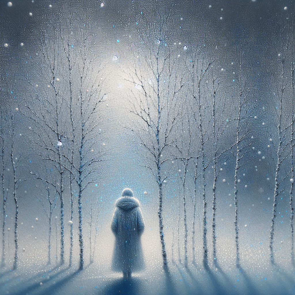 Prompt: A lone figure in a silver coat stands amid a snowfall of whispering light.