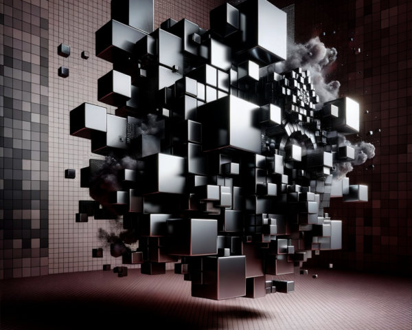 Prompt: A masterpiece of abstract surrealist cubism. An abstract surrealist composition of several overlapping and merging shiny anthracite-black cubes of varying sizes with silver edges, floating in space. A checkered background in varying shades of gray is visible in the distance. Lobachevsky geometry. 3D effect. Soft burgundy backlight.