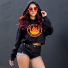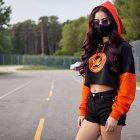 Prompt: Girl in brown hair and a big red streak through the right side of hair, slightly covered by a black hood from a hoodie with a fire symbol in the center of the hoodie, gray eyes, gray jean shorts, red gray and black colored shoes, full body and hands in hoodie pocket