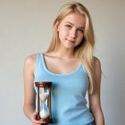 Prompt: A girl in long wavy blonde hair partially tied back in a messy bun wearing a plain emerald green hoodie and black jean shorts holding fire in her palm