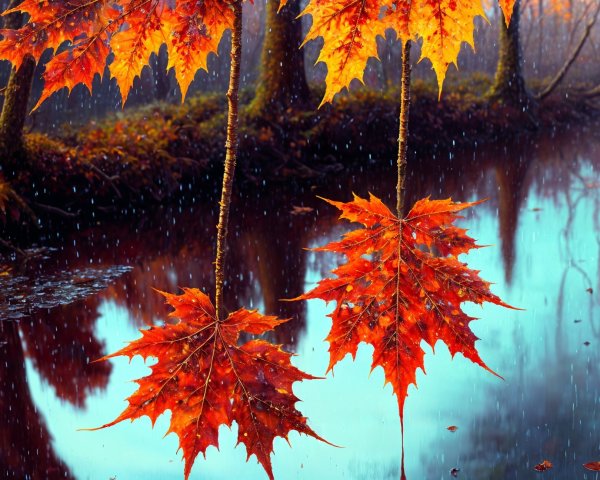 Prompt: artwork of intensified raindrops splattering one colorfull appel transparent under translucent leaves in an opulent garden, centred, bold colours and a dark backround
