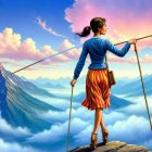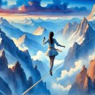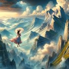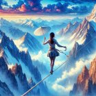 • Prompt: Young woman, acrobat, balancing on a bicycle, high altitude, mountain peaks, breathtaking aerial view, vast abyss below, sense of vertigo, perilous feat, adrenaline rush, extreme sports, fearless performer, dramatic clouds, mountain range backdrop, dynamic pose, intense concentration, vibrant colors, natural lighting, high-resolution, digital illustration, realistic with a touch of fantasy, by Alex Ross and Simon Stålenhag
