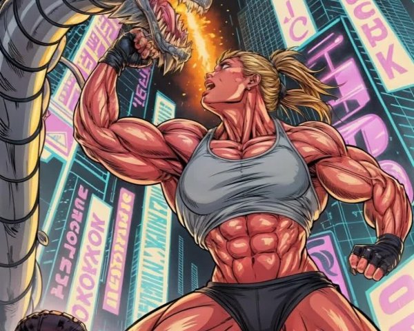 Prompt: Anime action scene, dynamic wide shot: A powerful female bodybuilder with glowing muscles fights a robotic dragon in a neon-drenched city. Pencil sketch style, detailed musculature, sharp robotic edges, dynamic poses, gritty urban background with neon signs. Dramatic backlighting, high contrast, 80s synthwave aesthetic, anime key visual, action pose, detailed illustration, comic art, vibrant colors, intense action, strong outlines, high detail, dynamic composition.Turn this image into Conceptual Art with Airbrush Art, Realism, Cel shaded and Anime Style Visuals of Video game cover The King of Fighters 2000,but keep this image at original source and 100% accuracy