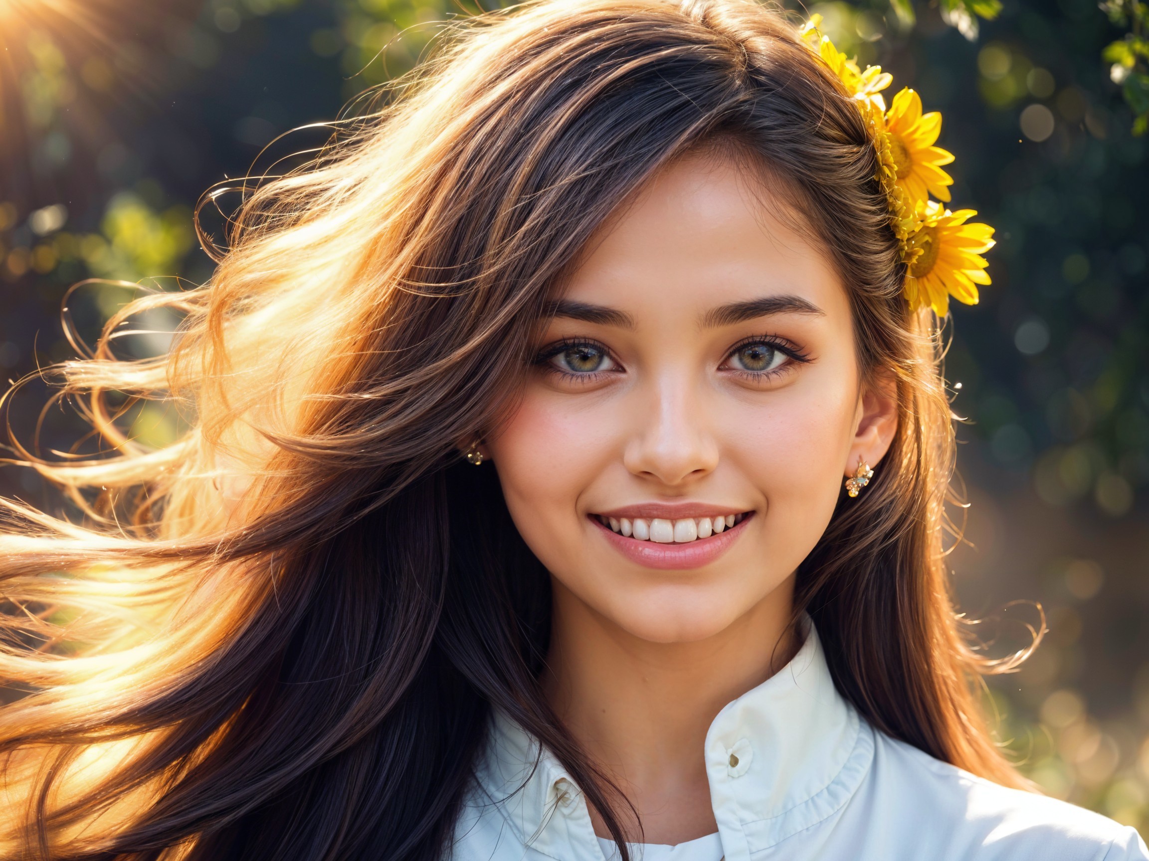 Prompt: A young woman with long, flowing hair adorned with a bright sunflower, smiling warmly at the camera. She has expressive eyes and a gentle, natural makeup look. The background features a soft-focus of green foliage, illuminated by warm sunlight, creating a cheerful and serene ambiance. The overall mood is joyful and vibrant, emphasizing her youthful energy and beauty.