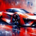 Prompt: A futuristic concept car render with a sleek aerodynamic design, featuring a red, white, and navy blue color scheme. The car has a low-slung profile with a pointed nose and a streamlined body that tapers towards the rear. The design incorporates sharp angles and flowing curves, with a distinctive red wing-like structure at the rear. The vehicle has large chrome wheels with low-profile tires and a transparent windscreen. The bodywork has aggressive body lines and panels that wrap around the vehicle, creating a dynamic silhouette. The car is positioned on a dark gray surface against a black background, casting subtle shadows. The lighting creates highlights on the metallic surfaces, emphasizing the car's curves and contours. The image has a professional automotive photography style with dramatic studio lighting that accentuates the vehicle's futuristic design elements.