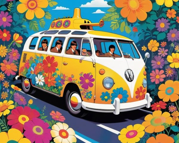 Prompt: John Lennon dressed in a white bell-bottom suit, playing electric guitar with a calm pose and serene appearance, reflecting peace, acrylic painting in the style of David Hockney, background in pastel colors.