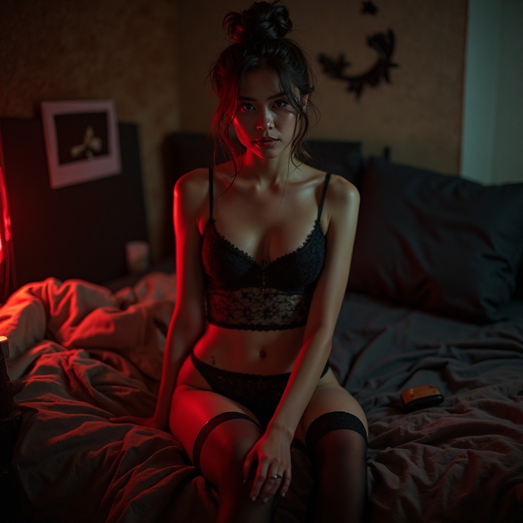 Prompt: An ultra-detailed photograph shows a full body young woman, slightly messy room, the dim lighting and a subtle blur effect contribute to the edgy and moody atmosphere, while the rich reds and deep shadows entice the viewer into this enchanting scene, she is on a bed, with a long hair, she is wearing a lace thong and thigh-high stockings and dressed in a tight transparent simple top with a hard nipples showing the bosom curves