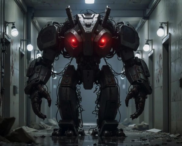 Prompt: The image depicts a massive, menacing mechanical entity—resembling a dark, corrupted fusion of Voltron and industrial machinery—dominating a narrow, derelict hallway. The creature is bipedal, heavily armored with thick, segmented plates of what appears to be tarnished or blood-stained metal, and emits an eerie red glow from its core and two prominent ocular sensors. A chaotic tangle of thick, dark cables and biological-looking sinews wraps around its frame, suggesting organic integration or parasitic control. The setting is an institutional hallway, heavily stained with grime, moisture, and possible bio-matter. Two powerful, exposed klieg lights are fixed above, casting harsh, conical beams of light onto the entity and illuminating the decay. This strong, centralized lighting creates deep shadows, emphasizing the abandoned and oppressive atmosphere characteristic of Silent Hill or Atomic Heart aesthetics. The floor is strewn with debris and standing water, reflecting the oppressive figure and the glaring lights, adding to the sense of isolation and imminent danger. The faint designation "SCP-738-Alpha" is visible on the left wall, grounding the scene in the requested containment context.