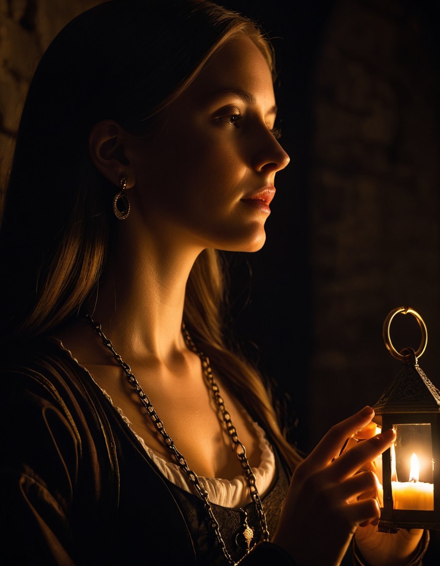 Prompt: Side view of a medieval chatelaine holding a ring of keys in her hand. Dark, candlelit scene. View is from shoulders down, showing only the side of her dress and the keys she holds.