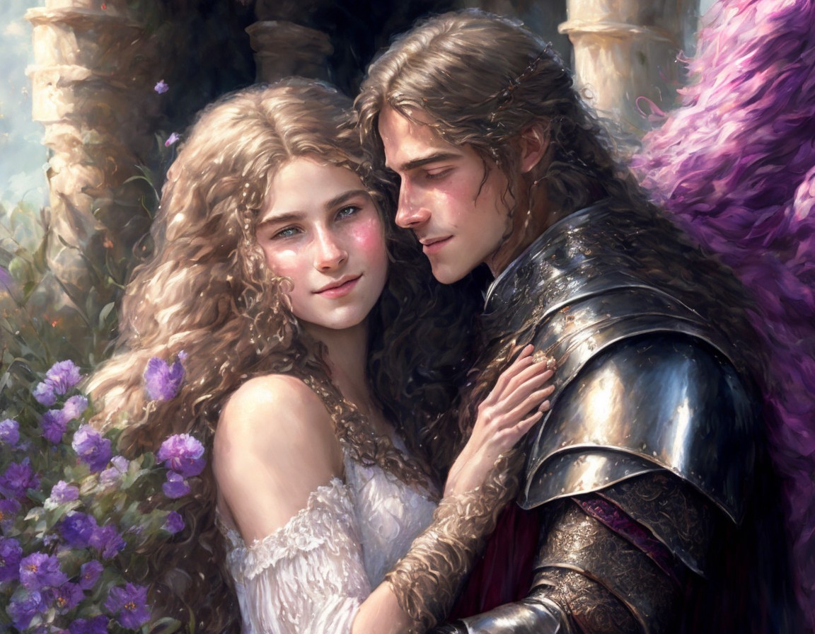 Prompt: Under a starlit sky, a medieval maiden and knight embrace for their first kiss in a moonlit garden. The scene is set with a towering castle in the background, blooming roses, flickering torches, a flowing gown, intricate knight's armor, soft moonlight, a gentle breeze, romantic atmosphere, medieval architecture, passion in their eyes, medieval romance, historical love, tender moment, digital painting, detailed textures, warm and soft color palette, by John William Waterhouse and Edmund Blair Leighton, Artstation.