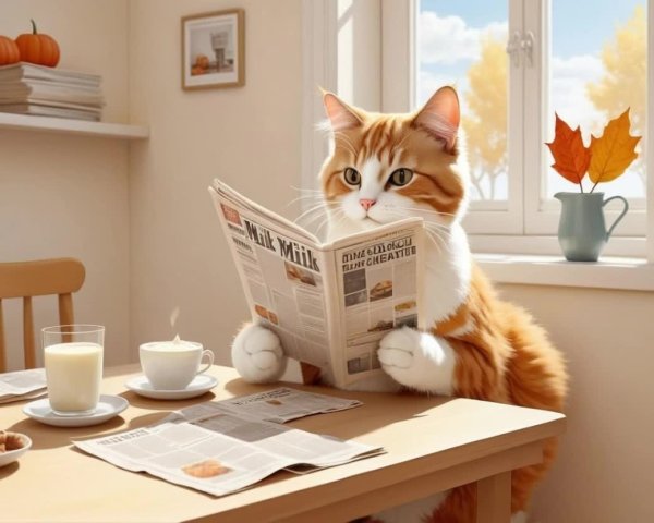 Prompt: Cartoon illustration of a ginger cat serving mackerel on plates. Smiling happy cat with a white apron. There is a glass jug of milk and cups on the table. The cat stands next to the table and transfers the mackerel from the tray to the plates.