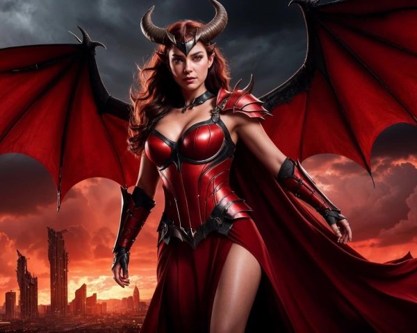 Prompt: The scene is dynamic, dramatic light and shadows. Against the backdrop of a completely destroyed city. In a red, stormy sky with glowing clouds. She wearing a short, deep red dress, demon armor and very larges ((black-red, bat wings)), (((red skin))), ((horns)). A stunningly hyper-detailed photograph. An ultra-realistic, any bad anatomy, UHD 32K, HDR image of a smiling demon, full body perspective from head to feet. She has an anatomically advanced details like muscle definition. The composition is centered and balanced. With glowing lightning arcs crackling around her body. Her face obeys the rule of the golden middle. Professional portrait photography by Mark Mann, by Steve McCurry, shot on DSLR. Game of a dramatic, dynamic light and shadows. That highlights her face perfectly. The image is (hyper-realistic) with (sharp, deep focus), reproduced with a resolution of 64 megapixels. Octane render. The cinematographic quality masterpiece.