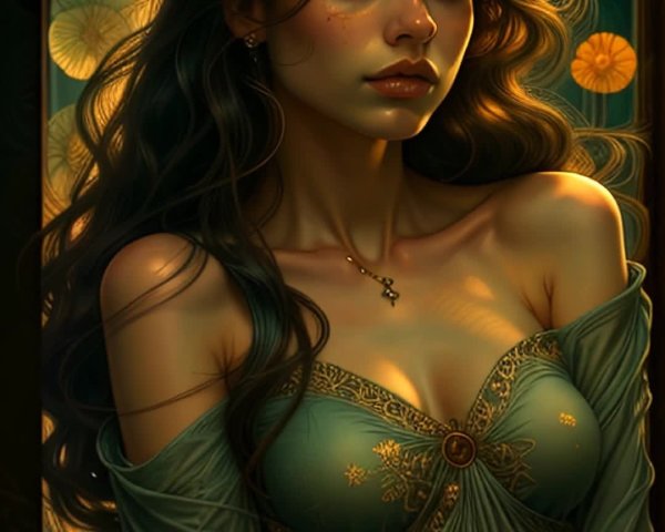 • Prompt: A flower-woman of great beauty, shown in profile with graceful feminine features. Her long flowing hair transforms seamlessly into a cascade of flowers and petals, doubling as an ornate gown that drapes elegantly around her body. The hair-robe is richly adorned with blossoms in radiant reds, oranges, and yellows, alive with natural detail and delicacy. She stands within a lush botanical landscape of majestic trees and giant blooms, bathed in the warm golden light of a sunset. The glowing sun at golden hour infuses the scene with warmth, enhancing the vivid reds of the flowers and imbuing the entire setting with poetic radiance. The mood is harmony, serenity, and luminous utopia. Artistic style: Fine Art Illustration inspired by botanical painting and Art Nouveau, with soft luminous modeling, intricate floral detail, organic flowing composition, and a warm painterly palette of reds, oranges, yellows, greens, browns, and golden light.By Arthur Rackham, Ernst Haeckel, Boris Vallejo, Alphonse Mucha, Luis Royo and Boris Vallejo.