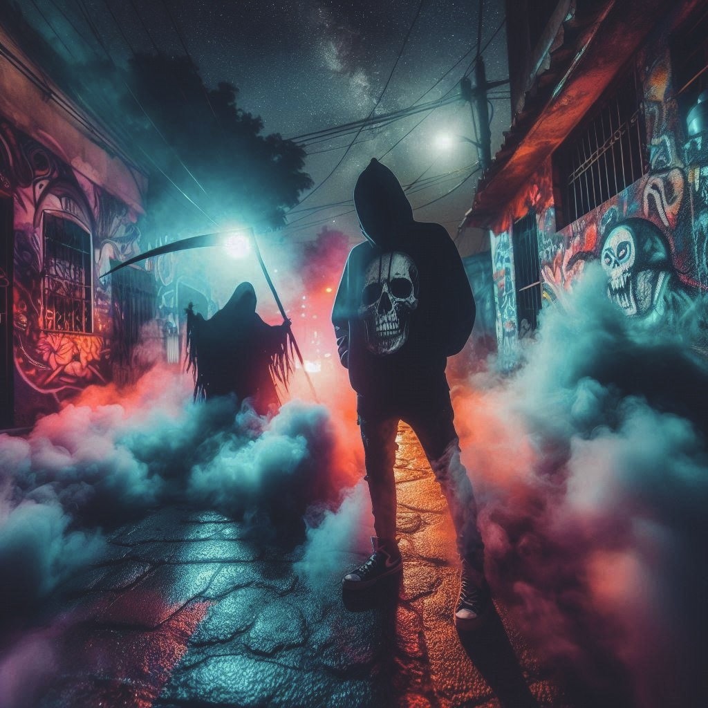 Hooded Figure in Misty Alley with Neon Graffiti 30w