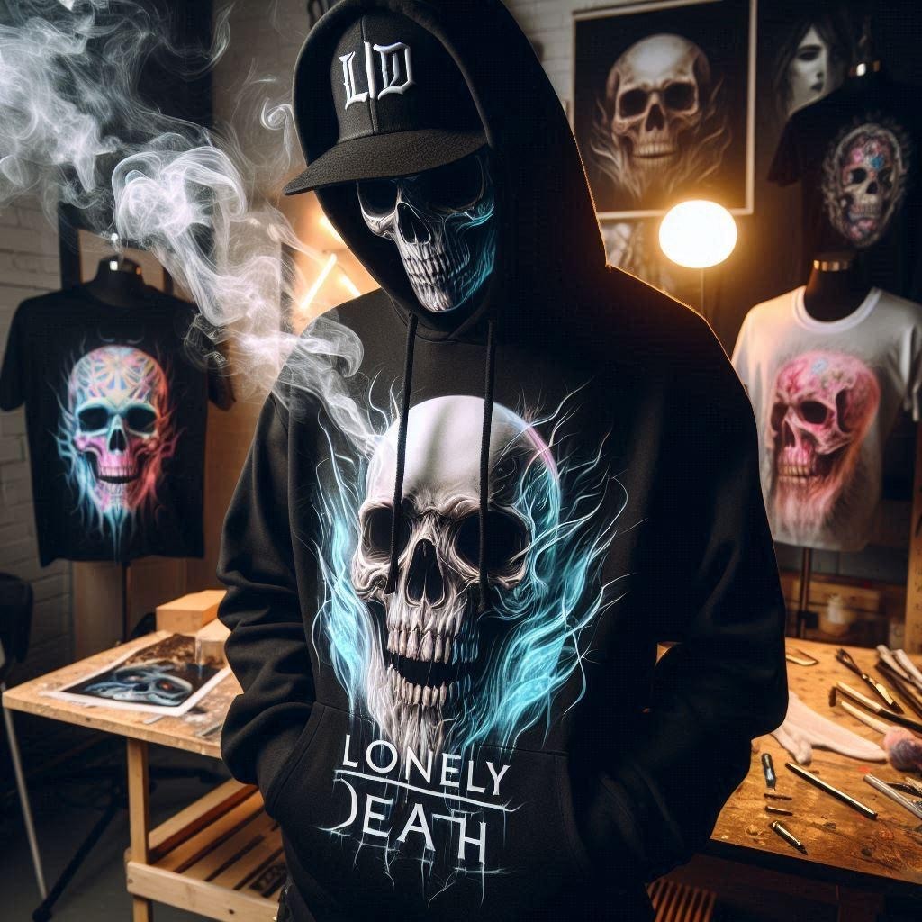 Person in Black Hoodie with Skull Design in Cluttered Room 31w