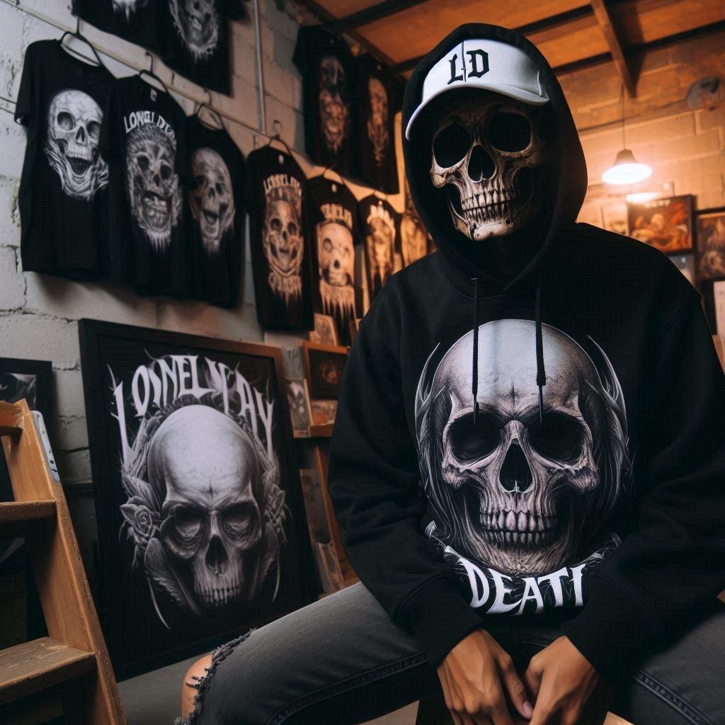 Person in Black Hoodie with Skull Design in Cluttered Room