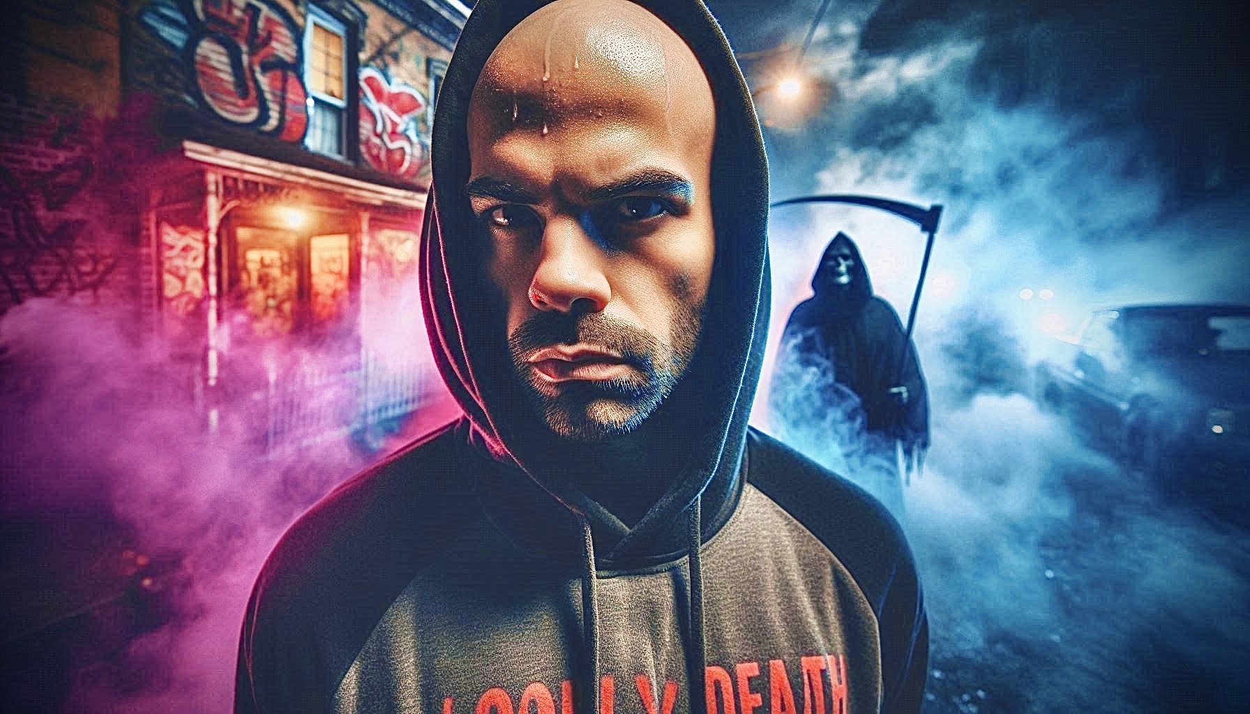 Bald Man in Hoodie with Mysterious Figure in Fog
