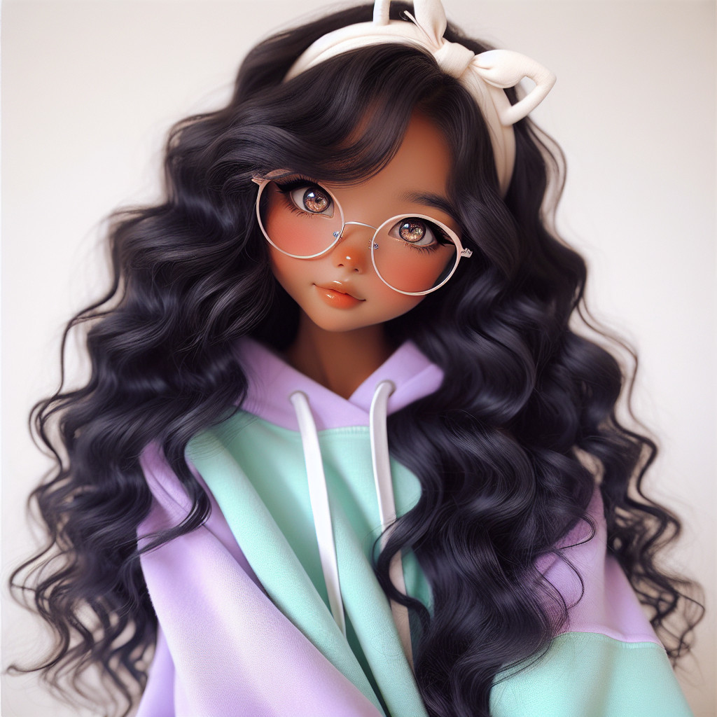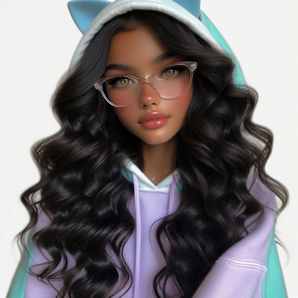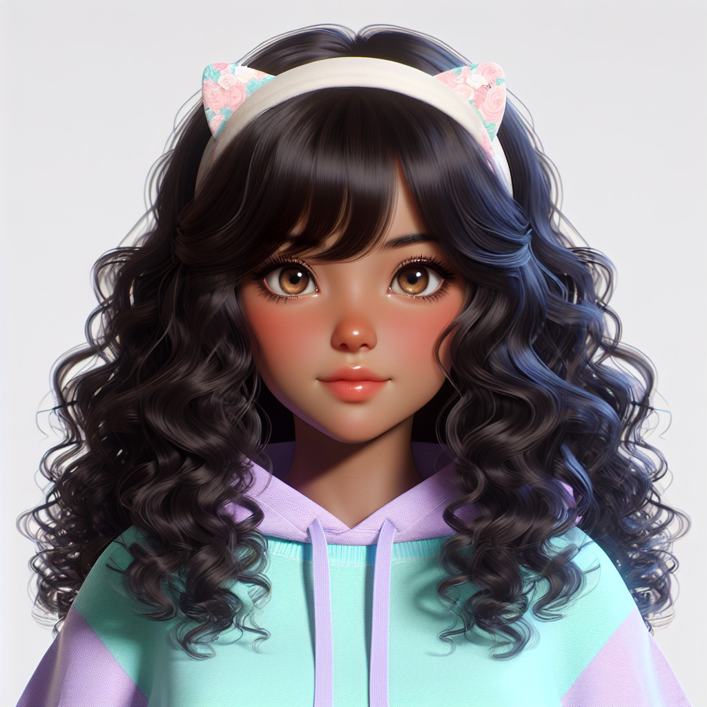 Prompt: A tan, cute 13-year-old girl with long, glossy black curls cascading past her shoulders. She wears a pastel purple and aqua green hoodie, casually draped without the hood covering her head. Her hazel eyes shimmer with warmth and curiosity, framed by soft waves of hair. A white headband with adorable kitty ears sits atop her head, adding a playful touch. Resting gently on her face are stylish light purple glasses, perfectly complementing her cozy yet vibrant look. The crisp white background keeps the focus on her, making her stand out effortlessly.