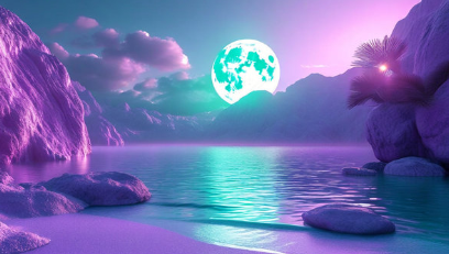 Prompt: A mystical landscape under a large, luminous moon with turquoise and vibrant violet hues. The foreground features dramatic rock formations and wispy clouds that reflect the moonlight, creating a dreamlike atmosphere. The sky transitions from soft pastels to deeper shades, enhancing the magical quality of the scene.