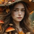 Prompt: real fairy looking woman sat on a tree stump in the old looking woods.a deer is in the distance looking at her has the fairy is holding a mushroom.the woods are old looking and no one or nothing is around.there is mist and dead leafs that has droped from the trees.
